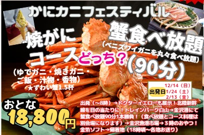 各地ご集客→最終集合場所出発(9時頃)→トレインパーク白山(2024年3月OPEN)→金澤港にて蟹食べ放題(90分一本勝負)→近江町市場散策→金箔工芸館にて3時のおやつ金箔ソフトクリーム→道の駅休憩・お土産→帰着地(18時頃から各地お送りいたします)