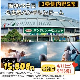 出発(~10時)→名古屋バンテリンドーム(昼食自由食/デーゲーム)→帰着地(20時~各地へお送り致します)